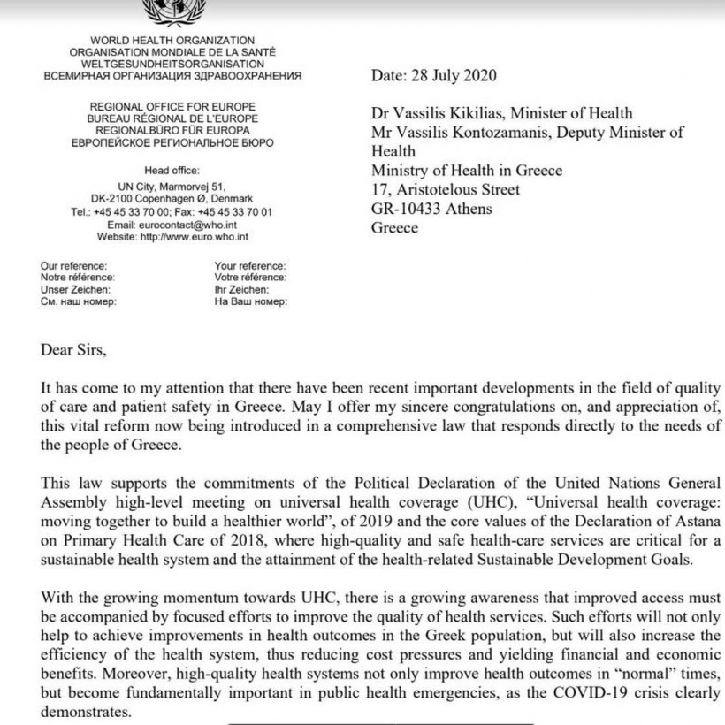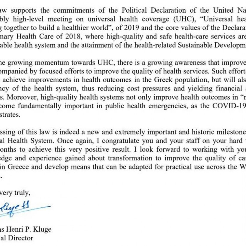 Ο κ. Hans Kluge έστειλε συγχαρητήρια επιστολή προς τον Υπουργό Υγείας Βασίλη Κικίλια και τον Υφυπουργό Υγείας Βασίλη Κοντοζαμάνη για τη νομοθετική πρωτοβουλία της ίδρυσης του Οργανισμού Διασφάλισης της Ποιότητας στην Υγεία (Ο.ΔΙ.Π.Υ. Α.Ε.).