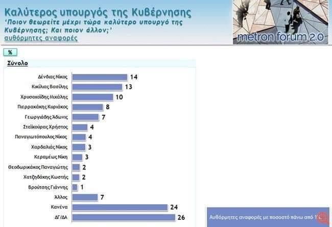 Δείτε αναλυτικά την κατάταξη στην ερώτηση ποιος είναι ο καλύτερος υπουργός της κυβέρνησης μέχρι τώρα.