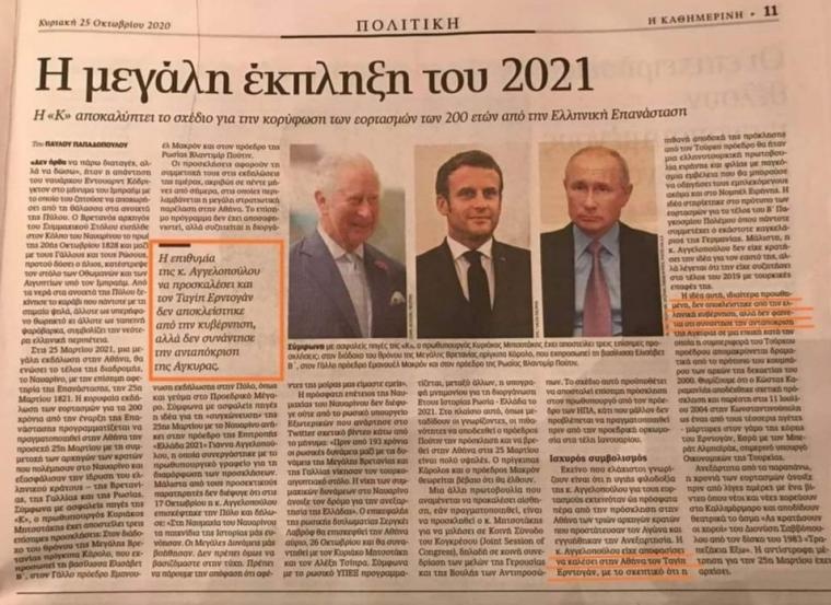 «Η κυρία Αγγελοπούλου είχε αποφασίσει να καλέσει στην Αθήνα τον Ρ. Τ. Ερντογάν, με το σκεπτικό ότι η πιθανή αποδοχή της πρόσκλησης από τον Τούρκο πρόεδρο θα ήταν μία ελληνοτουρκική πρωτοβουλία ειρήνης και φιλίας! Η ιδέα αυτή, δεν αποκλείστηκε από την Κυβέρνηση, αλλά δεν φαίνεται ότι συνάντησε την ανταπόκριση της Άγκυρας», αναφέρει το σχετικό ρεπορτάζ προκαλώντας ιδιαίτερη αίσθηση αφού η Άγκυρα απειλεί ευθέως την εθνική μας κυριαρχία και τα κυριαρχικά μας δικαιώματα.