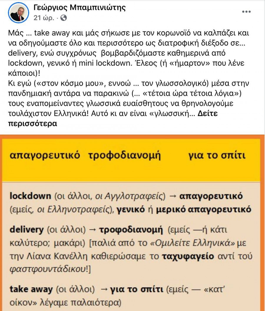 Με μια ανάρτησή του στο Facebook ο γνωστός γλωσσολόγος Γεώργιος Μπαμπινιώτης παρακίνησε τους πολίτες να χρησιμοποιούν σωστά τις λέξεις "take away", "delivery" και "lockdown", καθώς οι εν λόγω όροι δεν ανταποκρίνονται στα ελληνικά δεδομένα.