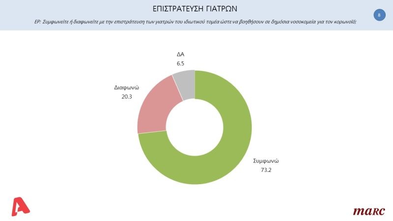 Στη δημοσκόπηση της Marc ένα από τα ερωτήματα αφορούσε την επιστράτευση των γιατρών που έγινε με εντολή του υπουργείου Υγείας, Βασίλη Κικίλια, με τους πολίτες να βλέπουν θετικά τη συγκεκριμένη απόφαση.