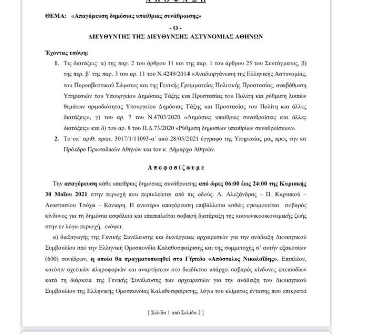 Ο κ. Αυγενάκης με δόλιους τρόπους εξασφάλισε εντολή του Διευθυντή Αστυνομίας Αθηνών σύμφωνα με την οποία απαγορεύεται κάθε δημόσια συνάθροιση για την Κυριακή 30 Μαΐου του 2021 και από ώρες 06:00 το πρωί με 24:00 το βράδυ.