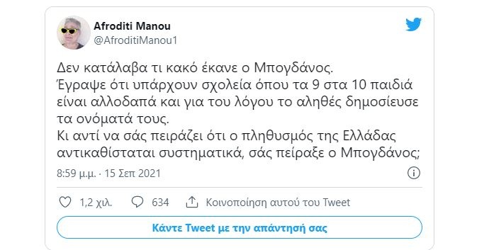 «Έγραψε ότι υπάρχουν σχολεία όπου τα 9 στα 10 παιδιά είναι αλλοδαπά και για του λόγου το αληθές δημοσίευσε τα ονόματά τους. Κι αντί να σας πειράζει ότι ο πληθυσμός της Ελλάδας αντικαθίσταται συστηματικά, σας πείραξε ο Μπογδάνος;» αναρωτήθηκε η κυρία Αφροδίτη Μάνου.