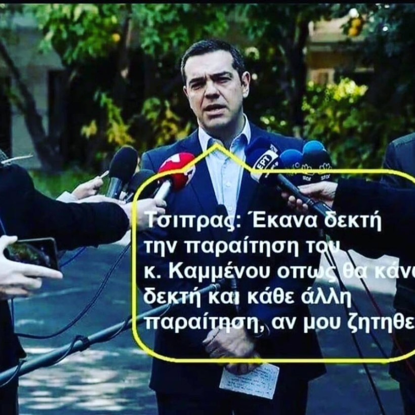 Σπάει το ίντερνετ η δήλωση του πρωθυπουργού ότι μετά την παραίτηση Καμμένου θα κάνει δεκτές όποιες άλλες παραιτήσεις κι αν προκύψουν. Τη δήλωση αυτή την είχε κάνει έξω από το μέγαρο Μαξίμου την περασμένη Κυριακή, όταν έλαβε χώρα το διαζύγιο με τον Πάνο Καμμένο.
