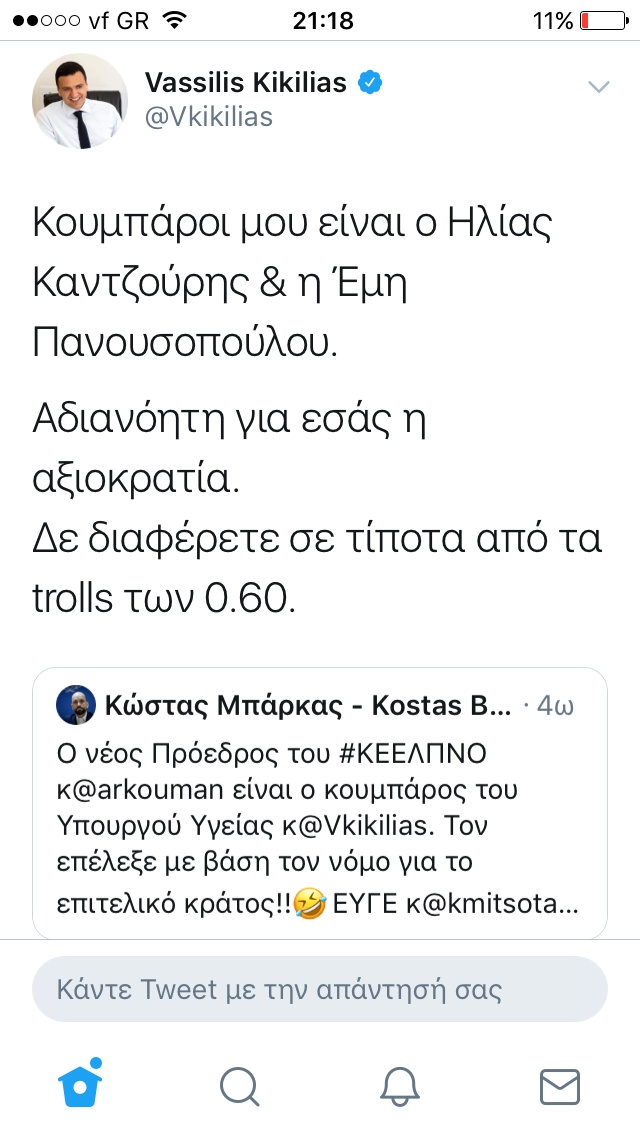 Απόψε, ο Κώστας Μπάρκας έβαλε στο στόχαστρο τον Βασίλη Κικίλια. Ο βουλευτής Πρέβεζας κατήγγειλε τον Υπουργό Υγείας μέσω twitter ότι διόρισε τον κουμπάρο του Πρόεδρο στον ΕΟΔΥ. Μόνο που ο κουμπάρος του Βασίλη Κικίλια και της Τζένης Μπαλατσινού, είναι άλλο πρόσωπο!