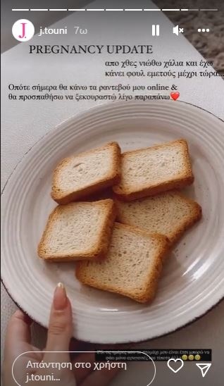 «Από χθες νιώθω χάλια και έχω κάνει φουλ εμετούς μέχρι τώρα. Οπότε σήμερα θα κάνω τα ραντεβού μου online και θα προσπαθήσω να ξεκουραστώ λίγο παραπάνω. Τις ημέρες που το στομάχι μου είναι έτσι μπορώ να φάω μόνο φρυγανιές και τίποτα άλλο», έγραψε η Ιωάννα Τούνη αναφερόμενη στις δυσκολίες της εγκυμοσύνης της.
