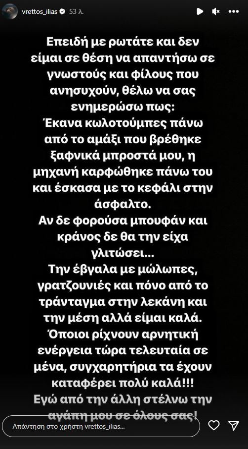 «Καλά μου μπήκε ο μήνας! Ευτυχώς τη γλίτωσα φτηνά. Όσο για τη μηχανή πάει», έγραψε ο Ηλίας Βρεττός.