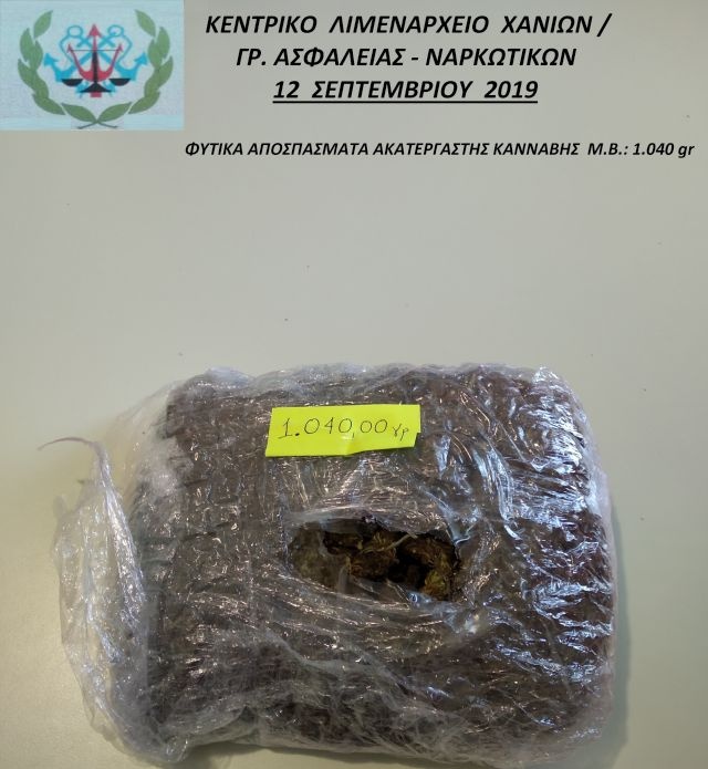 Συγκεκριμένα σε έλεγχο που διενεργήθηκε από τους λιμενικούς κατά τον κατάπλου πλοίου στον επιβατικό λιμένα Σούδας, με τη συνδρομή αστυνομικού σκύλου ανίχνευσης ναρκωτικών ουσιών Λ.Σ-ΕΛ.ΑΚΤ. «ΜΙΣΑ», ο εν λόγω αλλοδαπός προσπάθησε να διαφύγει, ενώ μετά τη σύλληψή του βρέθηκε εντός της χειραποσκευής του μία νάιλον συσκευασία περιέχουσα πιθανώς φυτικά αποσπάσματα κάνναβης, μικτού βάρους ενός κιλού και σαράντα γραμμαρίων, η οποία κατασχέθηκε.