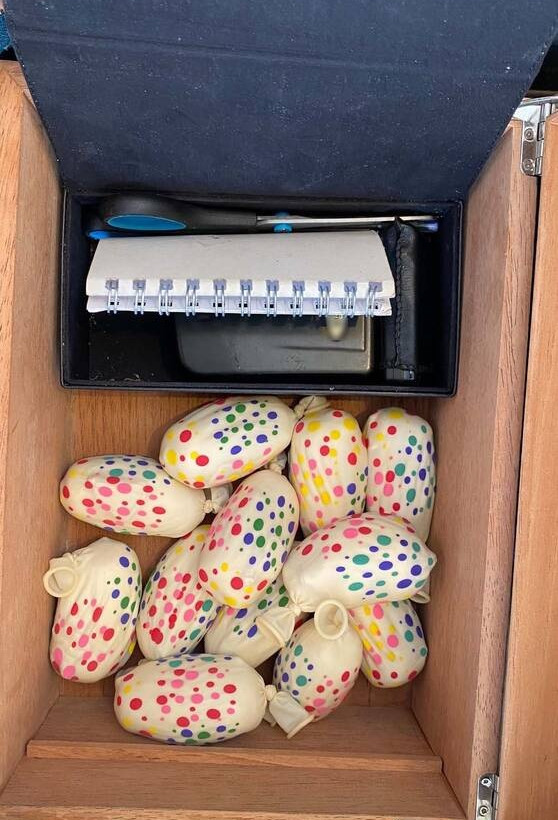 Στην κατοχή του 37χρονου και κατόπιν έρευνας τόσο σε όχημα που χρησιμοποιούσε όσο και σε δύο σπίτια στη Μύκονο όπου διέμενε, βρέθηκαν και κατασχέθηκαν: μισό κιλό κοκαΐνης, 432 γραμμάρια MDMA, 8,5 κιλά ακατέργαστης κάνναβης, 2,2 κιλά κατεργασμένης κάνναβης, 166 γραμμάρια κεταμίνης, 61 γραμμάρια tucibi, περίπου 1.400 ναρκωτικά δισκία ecstacy, 62,1 γραμμάρια τρίμματος ναρκωτικού δισκίου, πιστόλι, γεμιστήρας με φυσίγγια, ηλεκτρονικές ζυγαριές ακριβείας, δοσομετρητές και το ποσό των 180.100 ευρώ, σχετιζόμενο με εμπορία ναρκωτικών ουσιών.