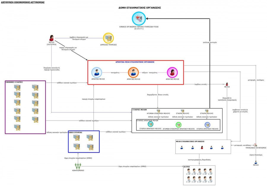 Επιπλέον, εντοπίσθηκαν άλλες 11 εικονικές εταιρείες και ατομικές οντότητες, χωρίς πραγματική δραστηριότητα, που εμφανίζονταν ως προμηθευτές του δικτύου, προκειμένου να προσδίδουν νομιμοφάνεια στις συναλλαγές τους και να δικαιολογούν το ιατρικό υλικό για το οποίο αποζημιώνονταν από τον ΕΟΠΥΥ και φαινομενικά παρείχαν στους ασφαλισμένους.