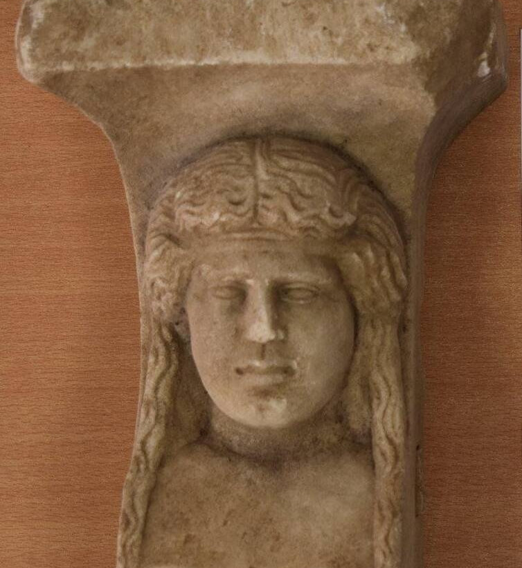 α) Ακέραιη μαρμάρινη Ερμαϊκή στήλη, με κεφάλι Ερμού με κυματοειδή κόμμωση, στο άνω τμήμα, η οποία στο μέσο του ύψους φέρει ανάγλυφο φαλλό και είναι πεσόμορφη, ρωμαϊκής εποχής προερχόμενη από επαρχιακό εργαστήριο, ύψους 71 εκ. και πλάτους 18 εκ. (Προέρχεται από αρχαία οδό και χρησίμευε ως οδοδείκτης)