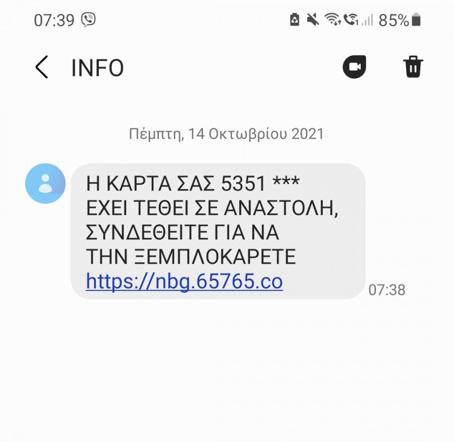 Ενδεικτικό είναι το μήνυμα που έχει σταλεί σε αρκετούς χρήστες κινητών, το οποίο αναφέρει πως η κάρτα τους έχει τεθεί σε αναστολή. Μάλιστα, μέσω του συγκεκριμένου SMS ζητείται από τον παραλήπτη του μηνύματος να κάνει κλικ σε ένα link, μέσω του οποίου καλείται να καταχωρήσει τα στοιχεία της κάρτας για τη λύση του δήθεν τεχνικού προβλήματος.