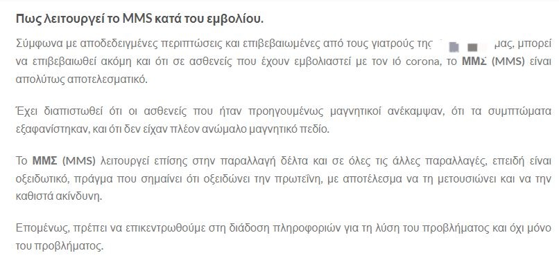 Αναλυτικότερα, σε ανάρτηση με τίτλο «Πώς λειτουργεί το MMS κατά του εμβολίου» αναφέρουν: «Σύμφωνα με αποδεδειγμένες περιπτώσεις και επιβεβαιωμένες από τους γιατρούς μας, μπορεί να επιβεβαιωθεί ακόμη και ότι σε ασθενείς που έχουν εμβολιαστεί με τον ιό corona, το MMS είναι απολύτως αποτελεσματικό. Έχει διαπιστωθεί ότι οι ασθενείς που ήταν προηγουμένως μαγνητικοί ανέκαμψαν, ότι τα συμπτώματα εξαφανίστηκαν και ότι δεν είχαν πλέον ανώμαλο μαγνητικό πεδίο. Το MMS λειτουργεί επίσης στην παραλλαγή Δέλτα και σε όλες τις άλλες παραλλαγές, επειδή είναι οξειδωτικό, πράγμα που σημαίνει ότι οξειδώνει την πρωτεΐνη, με αποτέλεσμα να τη μετουσιώνει και να την καθιστά ακίνδυνη. Επομένως πρέπει να επικεντρωθούμε στη διάδοση πληροφοριών για τη λύση του προβλήματος και όχι μόνο του προβλήματος».