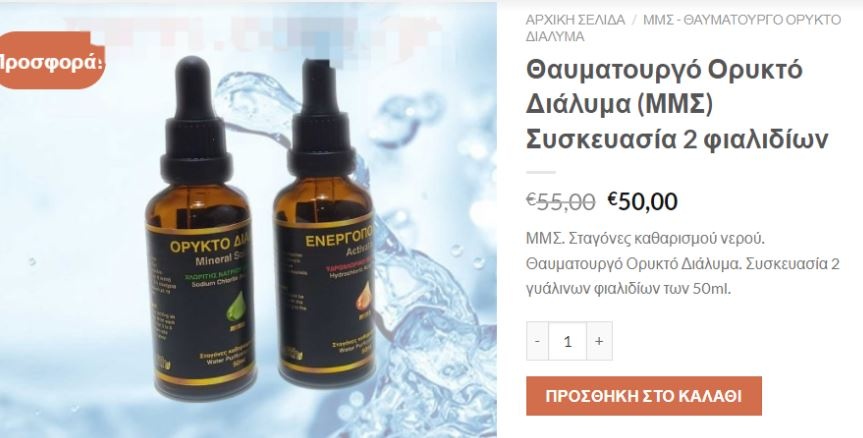 Πρόκειται για μία απάτη που είναι ιδιαίτερα διαδεδομένη στην Αμερική. Ο λόγος για το σκεύασμα με την ονομασία «Miracle Mineral Solution» ή «MMS», το οποίο διαφημιζόταν από επιτήδειους -πριν ακόμα εμφανιστεί ο κορονοϊός – ως το θαυματουργό υγρό που θεραπεύει μία σειρά από ασθένειες (AIDS κλπ). Με την εμφάνιση της πανδημίας οι επιτήδειοι συμπεριέλαβαν τον Covid-19 στην «ατζέντα» τους, με στόχο να κερδοσκοπήσουν εκμεταλλευόμενοι την εξάπλωση του κορονοϊού.