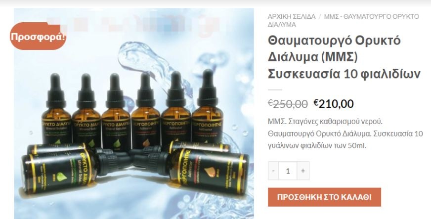 Όπως αποκαλύπτουν τα φωτογραφικά-ντοκουμέντα που δημοσιεύει το Newsbomb.gr, η συγκεκριμένη απάτη απλώνει τα δίχτυα της και στην Ελλάδα. Επικίνδυνα σκευάσματα που υπόσχονται θεραπεία από τον κορονοϊό και άλλες νόσους πωλούνται στο «εγχώριο» διαδίκτυο. Ηλεκτρονικό κατάστημα πουλάει έναντι 50 ευρώ δύο φιαλίδια του αποκαλούμενου «MMS». Σε άλλη ανάρτηση κάνουν έκπτωση πουλώντας έναντι 210 ευρώ 10 γυάλινα φιαλίδια.