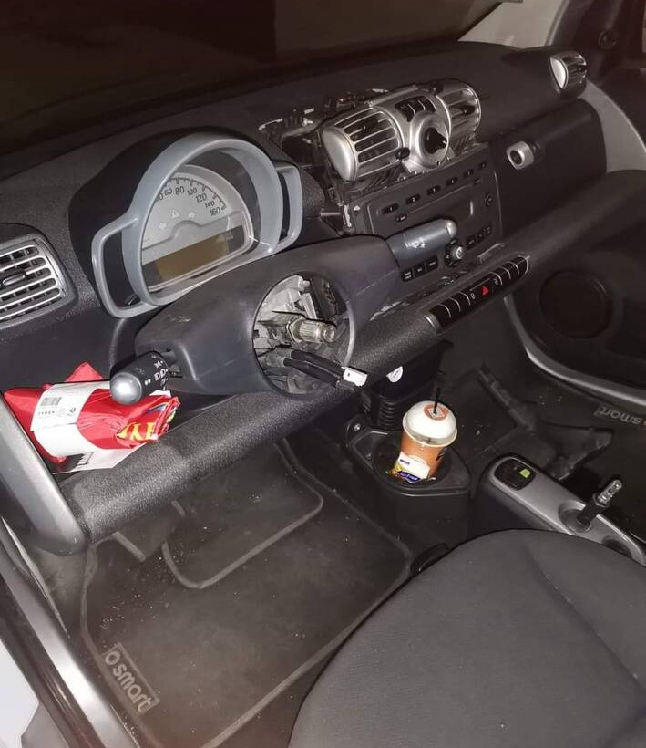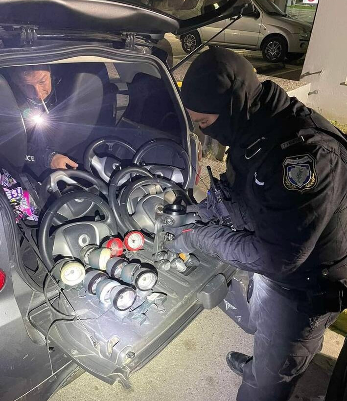 Αμέσως προχώρησαν στον έλεγχο του αυτοκινήτου ενημερώνοντας το κέντρο και αιφνιδιάζοντας τους υπόπτους. Στο πόρτ μπαγκάζ έκπληκτοι οι αστυνομικοί βρήκαν ανταλλακτικά από έξι αυτοκίνητα τύπου SMART. (τιμόνια, όργανα, λεβγιέδες ταχυτήτων κ λ.π.).
