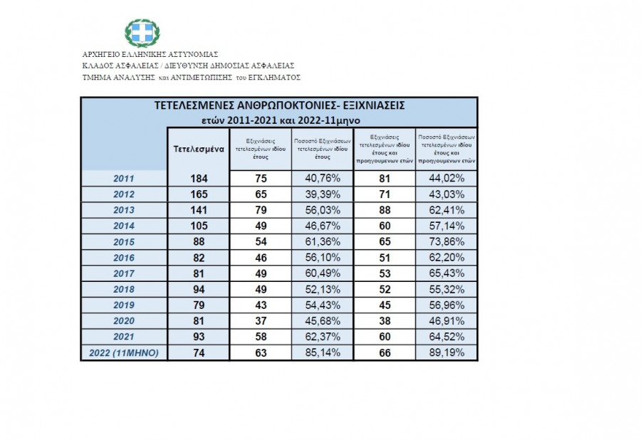 Ακολουθούν τα στατιστικά στοιχεία με τις δολοφονίες που δημοσίευσε η ΕΛ.ΑΣ.: