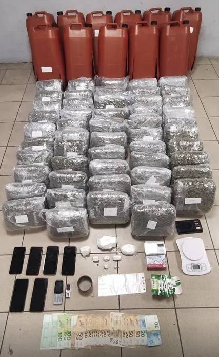 Συγκεκριμένα, αστυνομικοί του Τμήματος Γενικών Υποθέσεων, μετά από αξιοποίηση πληροφοριών, εντόπισαν τον 49χρονο με το όχημά του και τον 58χρονο με Ι.Χ. Φορτηγό σε χώρο στάθμευσης φορτηγών στην περιοχή των Διαβατών, όπου σε έλεγχο που ακολούθησε βρέθηκαν και κατασχέθηκαν από το Ι.Χ.Ε. αυτοκίνητο τέσσερα πλαστικά μπιτόνια, που περιείχαν (20) δέματα ακατέργαστης κάνναβης, συνολικού βάρους (20) κιλών και (497) γραμμαρίων, ενώ από το Ι.Χ. Φορτηγό επτά μπιτόνια με (32) δέματα ακατέργαστης κάνναβης, συνολικού βάρους (33) κιλών και (690) γραμμαρίων.