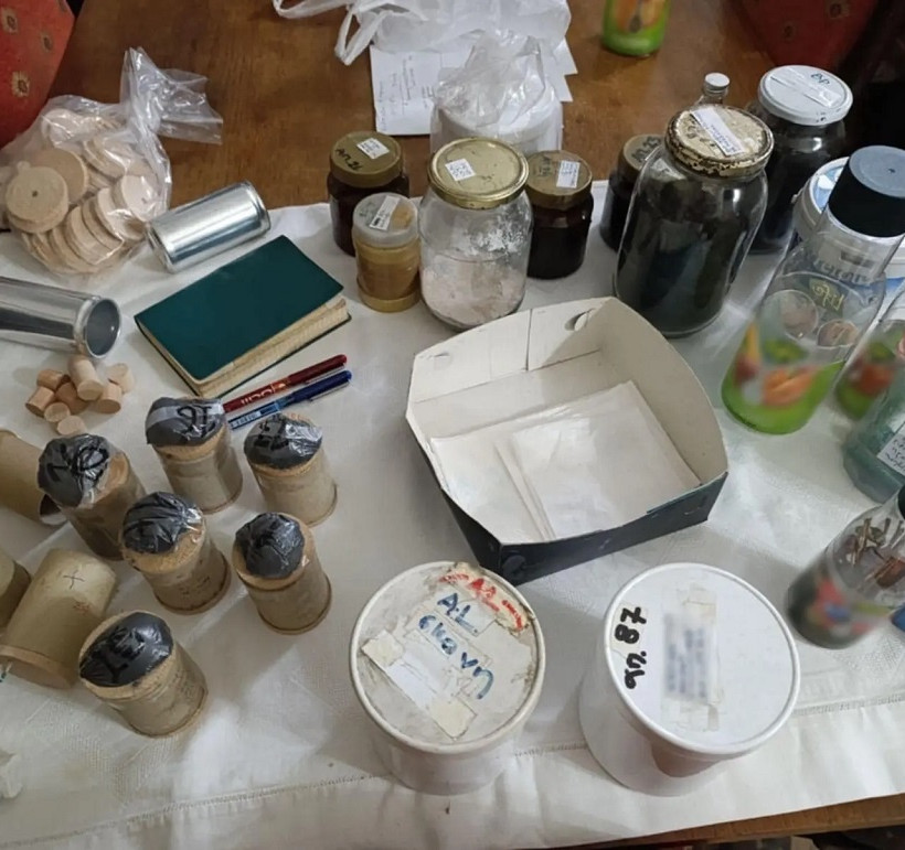 - μεγάλες ποσότητες υλικών που σχετίζονται με την παρασκευή πυρίτιδας, καθώς και πολυάριθμες συσκευασίες που περιείχαν είτε έτοιμη μαύρη πυρίτιδα (πλέον των 13 κιλών), είτε πρόδρομες χημικές ουσίες όπως νιτρικό κάλιο, θείο, ξυλάνθρακα, σκόνες μετάλλων (αλουμινίου, μαγνησίου), υγρά χημικά όπως μεθανόλη, διαιθυλαιθέρας
