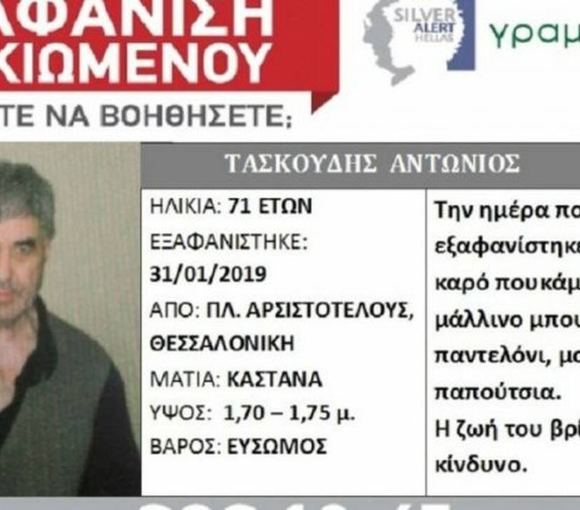 Αγνοούμενος παραμένει ο 71χρονος Τασκούδης Αντώνιος από τη Θεσσαλονίκη.