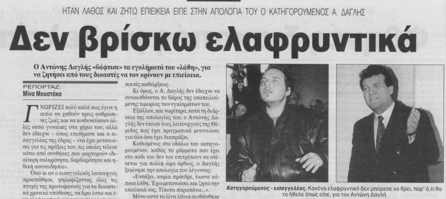 Ο Αντώνης Δαγκλής (1974 – 1997) ήταν μια από τις πιο σκοτεινές και γνωστές εγκληματικές φυσιογνωμίες της σύγχρονης Ελλάδας. Η ιστορία του συγκλόνισε τη χώρα τη δεκαετία του ’90, κυρίως λόγω της σκληρότητας των εγκλημάτων του και του ψυχολογικού προφίλ του. Σκοτεινός, με βαθιά μισογυνικά κίνητρα, ο Δαγκλής έγινε σύντομα γνωστός από τα ΜΜΕ ως «ο Έλληνας Τζακ Αντεροβγάλτης» ή ο «Αντεροβγάλτης των Αθηνών».