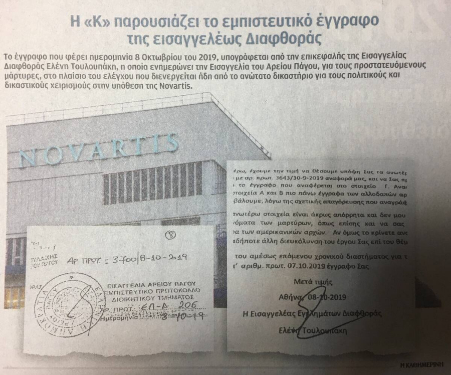 Το έγγραφο που φέρει ημερομηνία 8 Οκτωβρίου του 2019 υπογράφεται από την επικεφαλής της Εισαγγελίας Διαφθοράς Ελένη Τουλουπάκη, η οποία ενημερώνει την Εισαγγελία του Αρείου Πάγου για το πώς έγιναν τα πράγματα με τους προστατευόμενους μάρτυρες, στο πλαίσιο του ελέγχου που διενεργείται ήδη από το ανώτατο δικαστήριο για τους πολιτικούς και δικαστικούς χειρισμούς στην υπόθεση της Novartis.