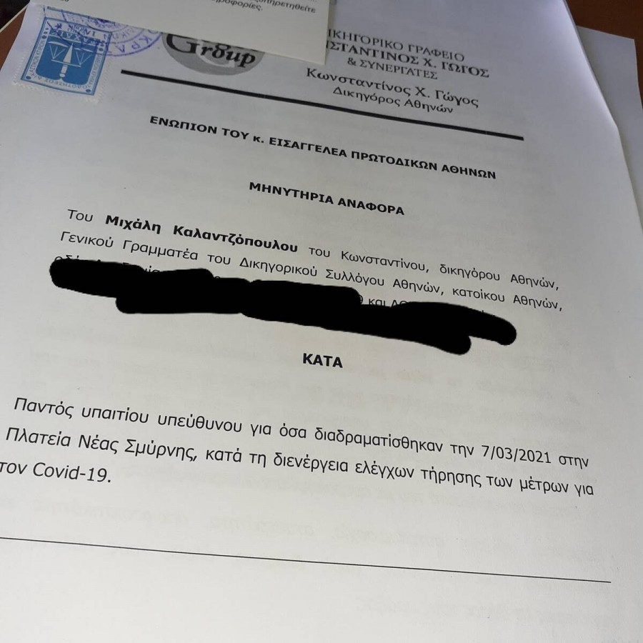 «Κατέθεσα σήμερα 8/03/2021 ενώπιον της Εισαγγελίας Πρωτοδικών Αθηνών μηνυτήρια αναφορά κατά παντός υπευθύνου για όσα διαδραματίστηκαν την 7/03/2021 στην Πλατεία Νέας Σμύρνης.