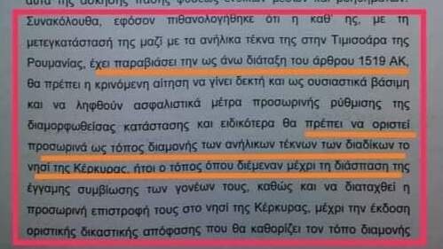 Το Μονομελές Πρωτοδικείο, λοιπόν, έχοντας βασιστεί στο εν λόγω άρθρο και το νέο του περιεχόμενο, όρισε προσωρινά ως τόπο διαμονής των ανήλικων τέκνων το νησί της Κέρκυρας και διέταξε την προσωρινή επιστροφή τους στο νησί της Κέρκυρας μέχρι να τελεσιδικήσει η δικαστική διαμάχη των δυο γονέων.