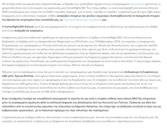«Με έκπληξη αλλά και αγανάκτηση παρακολουθούμε το θόρυβο που προκλήθηκε σήμερα από μη υπογεγραμμένο δημοσίευμα σχετικά με τις χρηματοδοτήσεις και τη λειτουργία της οργάνωσής μας HumanRights360. Το εν λόγω άρθρο, το οποίο αναπαρήχθη από κάποια ελληνικά ΜΜΕ επικαλούμενο μια «πηγή» και ένα δήθεν «ογκώδες πόρισμα», για το οποίο -ειρήσθω εν παρόδω- η οργάνωσή μας δεν έχει λάβει καμία ενημέρωση, ούτε ειδοποίηση- αναφέρει πλήθος ανακριβών στοιχείων και ψευδών ισχυρισμών διαστρεβλώνοντας τα πραγματικά στοιχεία που βρίσκονται αναρτημένα στην ιστοσελίδα μας, ως Ετήσιος Απολογισμός της Δράσης μας.