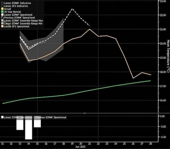 Πολύ σύντομα, οι θερμοκρασίες αναμένεται να φτάσουν τους 34 βαθμούς Κελσίου στο Βερολίνο και τους 27 βαθμούς στο Λονδίνο την επόμενη εβδομάδα, σύμφωνα με το μοντέλο του Ευρωπαϊκού Κέντρου Μεσοπρόθεσμων Προγνώσεων Καιρού.