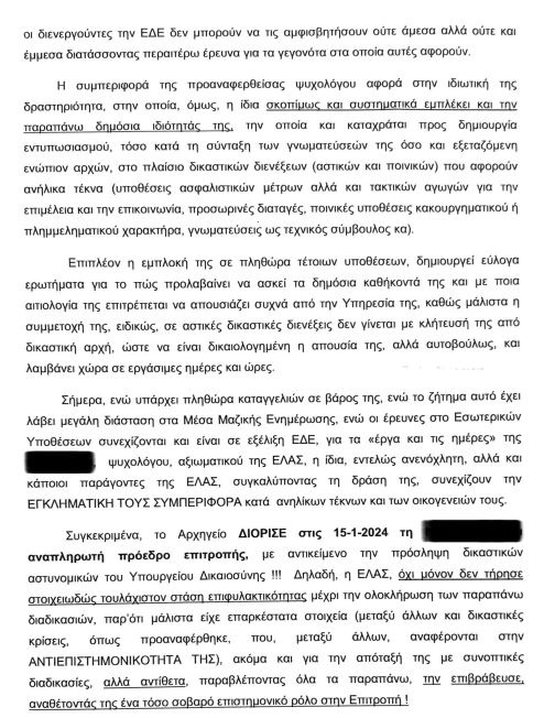Η ίδια, μας καταγγέλλει ότι έχει στην κατοχή της «επικίνδυνες, ψευδείς και πλαστές για το κοινωνικό σύνολο και το δημόσιο συμφέρον ψυχολογικές και ψυχιατρικές γνωματεύσεις, οι οποίες προέρχονται από τους εν λόγω ειδικούς από διάφορα μέρη της Ελληνικής Επικράτειας και αφορούν γονείς που έχουν ψευδώς κατηγορηθεί ότι έχουν ασελγήσει στα ανήλικα παιδιά τους και αντιμετωπίζουν σοβαρές ποινικές κυρώσεις, αφού αυτές αφορούν την εργαλειοποίηση και την ψυχική κακοποίηση των ανήλικων παιδιών, την ψυχική και οικονομική εξόντωση των κατηγορούμενων γονέων, την αποξένωση των κατηγορούμενων γονέων από τα παιδιά τους».