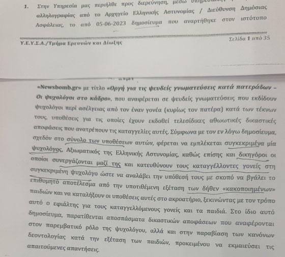 Ασκήθηκαν οι πρώτες διώξεις από τον Εισαγγελέα, όπως ήταν αναμενόμενο, κατά της ψυχολόγου της ΕΛ.ΑΣ., που κατηγορείται για την εμπλοκή της σε έκδοση ψευδών γνωματεύσεων για δικαστική χρήση, συνήθως κατά πατεράδων, σε περιπτώσεις συζυγικής αντιδικίας. Κάποιες από αυτές τις γνωματεύσεις έχουν αποτελέσει τη βάση για την ψευδή κατηγορία περί ασέλγειας σε ανηλίκους.