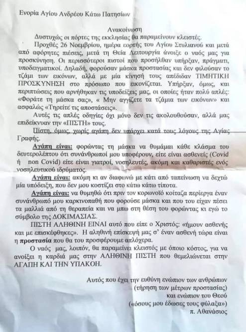 Στις 26 Νοεμβρίου 2020, ημέρα του Αγίου Στυλιανού, ο πατήρ Αθανάσιος βρέθηκε μπροστά σε μια κατάσταση που τον έκανε να γράψει μια ανακοίνωση και να την κολλήσει στην είσοδο της εκκλησίας.