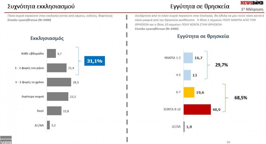 Ιδιαίτερα ενθαρρυντικό είναι, δε, το γεγονός ότι, όπως προκύπτει από την έρευνα της MRB για τo Newsbomb.gr, η πλειοψηφία των νέων (ηλικίες 17-34 ετών) τοποθετεί τον εαυτό της κοντά στην εκκλησία και την θρησκεία με ένα σημαντικό ποσοστό να προχωρεί και στον εκκλησιασμό με συχνότητα 1-2 φορές τον μήνα (εξαιρουμένων μυστηρίων όπως βαφτίσεις, κηδείες, γάμους).
