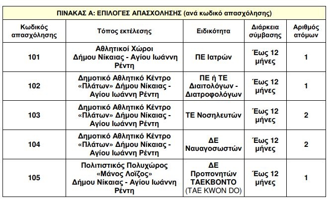 Αναλυτικότερα, γνωστοποιείται η σύναψη σύµβασης µίσθωσης έργου µε συνολικά 7 άτοµα για την κάλυψη αναγκών του ∆ήµου Νίκαιας – Αγίου Ιωάννη Ρέντη, που εδρεύει στη Νίκαια, µε αντικείµενο την εκτέλεση του έργου: «Παροχή Υπηρεσιών για τη ∆ιεύθυνση Αθλητισµού», συνολικής διάρκειας έως 12 µήνες.
