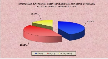 Όπως προκύπτει από τον παραπάνω Πίνακα, η έκρηξη της μερικής απασχόλησης και της εκ περιτροπής εργασίας είναι σοκαριστική, αφού για τον Δεκέμβριο 2019 ΜΟΝΟ το 42,8% των νέων προσλήψεων ήταν πλήρους απασχόλησης, ενώ ποσοστό 57,2% ήταν με καθεστώς μερικής και εκ περιτροπής εργασίας (43,1% και 14,1%, αντίστοιχα).
