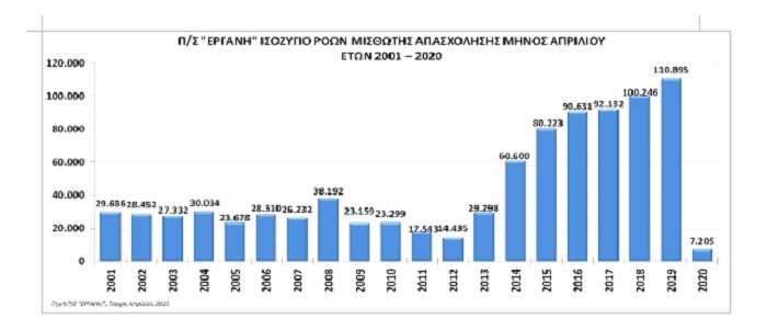 Όπως ανακοίνωσε το υπουργείο Εργασίας, «τα αποτελέσματα του πληροφοριακού συστήματος ΕΡΓΑΝΗ για τον μήνα Απρίλιο 2020 επιβεβαιώνουν τις αναμενόμενες αρνητικές επιπτώσεις στην αγορά εργασίας μετά την εκδήλωση της πρωτοφανούς και παγκόσμιου χαρακτήρα πανδημίας του Κορωνοϊού COVID-19 που δοκιμάζει και τη χώρα μας.