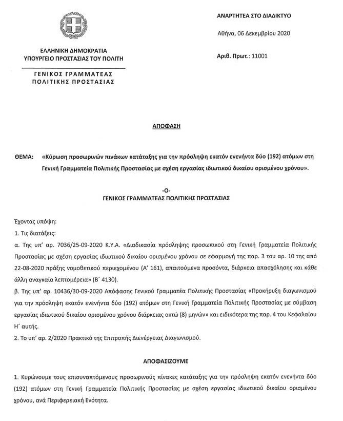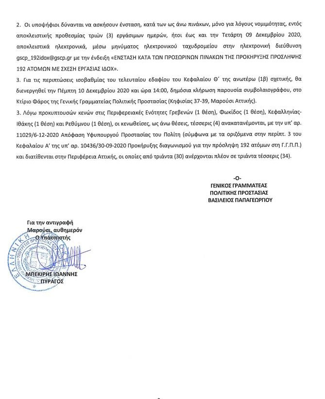 - Λόγω προκυπτουσών κενών στις Περιφερειακές Ενότητες Γρεβενών (1 θέση), Φωκίδος (1 θέση), Κεφαλληνίας-Ιθάκης (1 θέση) και Ρεθύμνου (1 θέση), οι κενωθείσες, ως άνω θέσεις, τέσσερις (4) ανακατανέμονται, με την υπ’ αρ. 11029/6-12-2020 Απόφαση Υφυπουργού Προστασίας του Πολίτη (σύμφωνα με τα οριζόμενα στην περίπτ. 3 του Κεφαλαίου Α’ της υπ’ αρ. 10436/30-09-2020 Προκήρυξης διαγωνισμού για την πρόσληψη 192 ατόμων στη Γ.Γ.Π.Π.) και διατίθενται στην Περιφέρεια Αττικής, οι οποίες από τριάντα (30) ανέρχονται πλέον σε τριάντα τέσσερις (34).