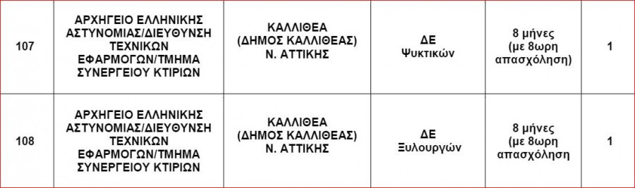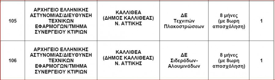 Γνωστοποιείται η πρόσληψη, με σύμβαση εργασίας ιδιωτικού δικαίου ορισμένου χρόνου, συνολικά είκοσι πέντε (25) ατόμων για την κάλυψη εποχικών ή παροδικών αναγκών και την ενίσχυση των Υπηρεσιακών Συνεργείων της Διεύθυνσης Τεχνικών Εφαρμογών του Αρχηγείου Ελληνικής Αστυνομίας που εδρεύει στο Δήμο Αχαρνών του Νομού Αττικής.