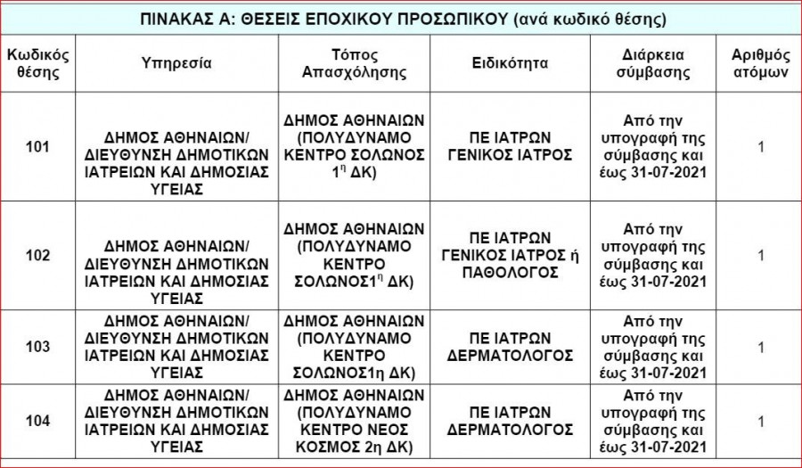 Αναλυτικότερα, ο Δήμος Αθηναίων ανακοινώνει την πρόσληψη 6 ατόμων με σύμβαση εργασίας ιδιωτικού δικαίου ορισμένου χρόνου, στη Διεύθυνση Ιδιωτικών Ιατρείων και Δημόσιας Υγείας. Μέχρι 19/3 οι αιτήσεις προσλήψεων.