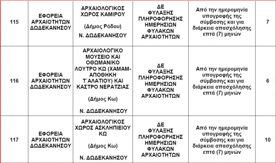 Η Εφορεία Αρχαιοτήτων Δωδεκανήσου γνωστοποιεί την πρόσληψη 108 ατόμων με σύμβαση εργασίας ιδιωτικού δικαίου ορισμένου χρόνου για την κάλυψη εποχικών η παροδικών αναγκών.