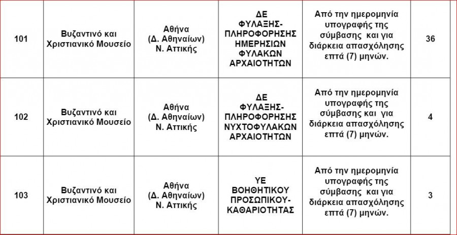 Γνωστοποιείται η πρόσληψη, με σύμβαση εργασίας ιδιωτικού δικαίου ορισμένου χρόνου, συνολικά 43 ατόμων για την κάλυψη εποχικών ή παροδικών αναγκών του Βυζαντινού και Χριστιανικού Μουσείου, που εδρεύει στην Αθήνα του Νομού Αττικής.