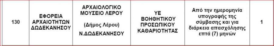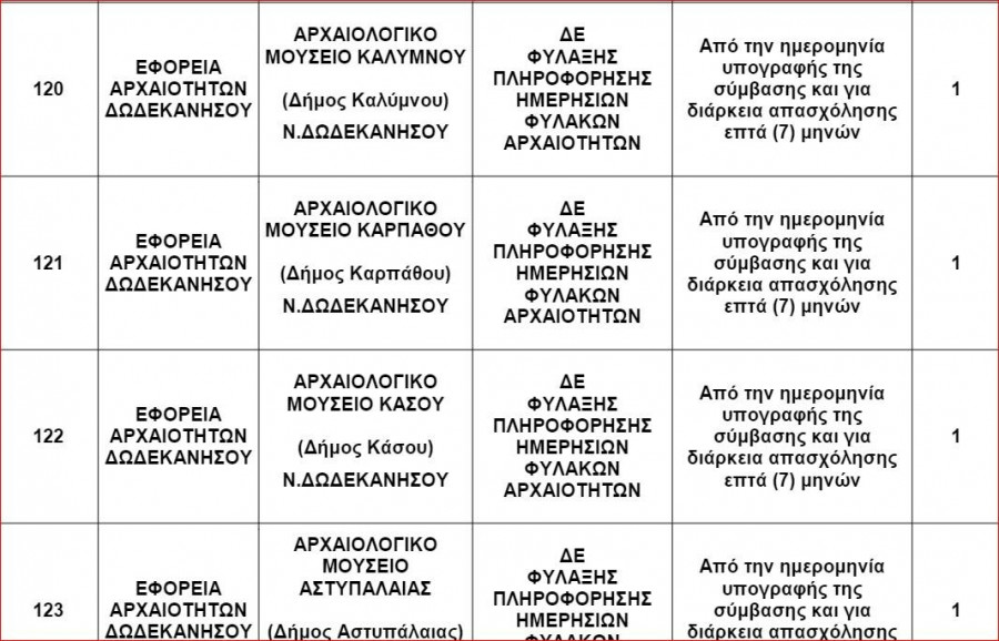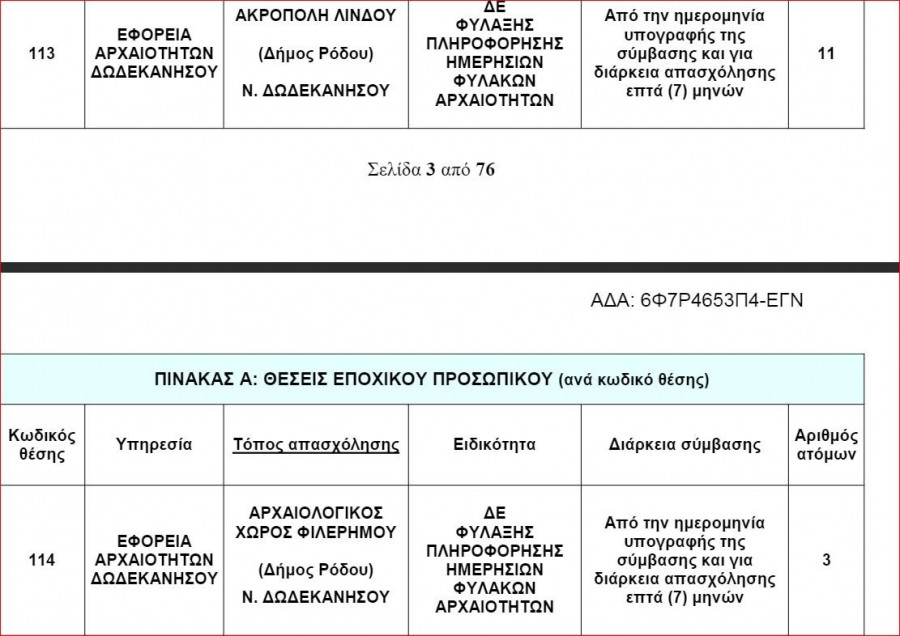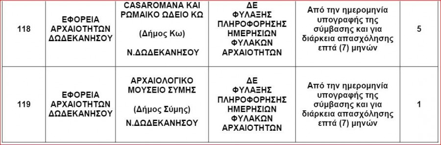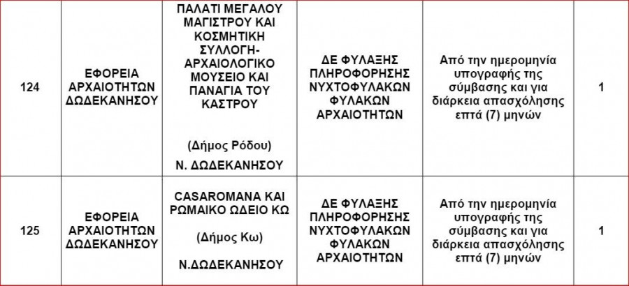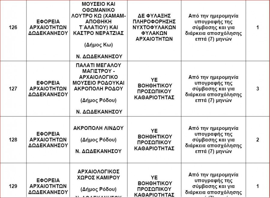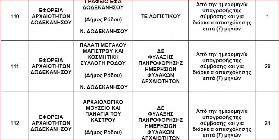 Η Εφορεία Αρχαιοτήτων Δωδεκανήσου γνωστοποιεί την πρόσληψη 108 ατόμων με σύμβαση εργασίας ιδιωτικού δικαίου ορισμένου χρόνου για την κάλυψη εποχικών η παροδικών αναγκών.