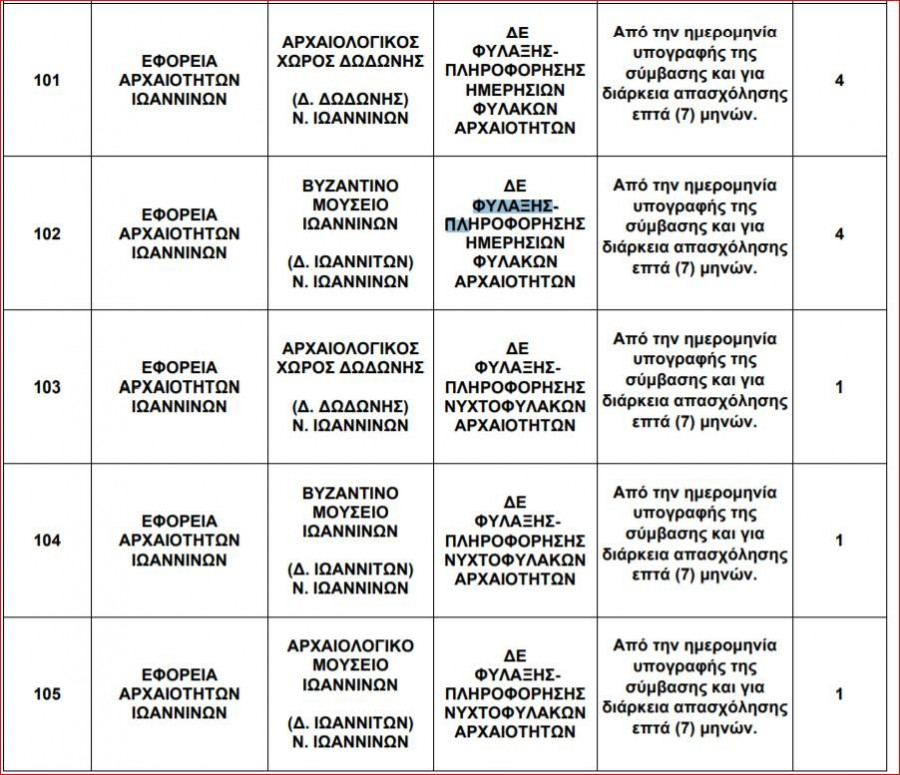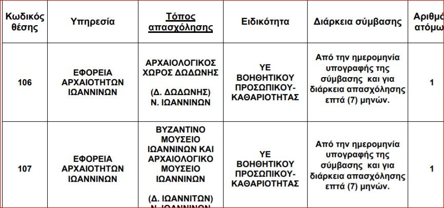 Γνωστοποιείται η πρόσληψη, με σύμβαση εργασίας ιδιωτικού δικαίου ορισμένου χρόνου, συνολικά 13 ατόμων για την κάλυψη εποχικών ή παροδικών αναγκών της Εφορείας Αρχαιοτήτων Ιωαννίνων, που εδρεύει στα Ιωάννινα του Νομού Ιωαννίνων.