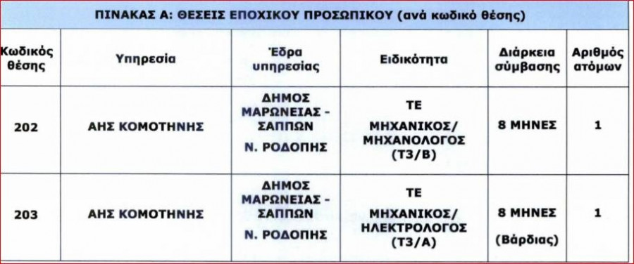 Ανακοίνωση για την πρόσληψη στη ΔΕΗ, με σύμβαση εργασίας ιδιωτικού δικαίου ορισμένου χρόνου, συνολικά πέντε (05) ατόμων για την κάλυψη εποχικών ή παροδικών αναγκών του Κλάδου ΑΗΣ ΚΟΜΟΤΗΝΗΣ, που εδρεύει στο Δήμο Μαρωνείας - Σαππών του Νομού Ροδόπης, του εξής, ανά υπηρεσία, έδρα, τόπο απασχόλησης, ειδικότητα και διάρκεια σύμβασης, αριθμού ατόμων με τα αντίστοιχα απαιτούμενα (τυπικά και τυχόν πρόσθετα) προσόντα .