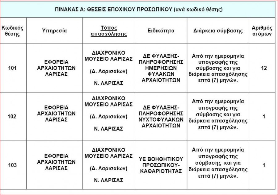 Γνωστοποιείται η πρόσληψη, με σύμβαση εργασίας ιδιωτικού δικαίου ορισμένου χρόνου, συνολικά 14 ατόμων για την κάλυψη εποχικών ή παροδικών αναγκών της Εφορείας Αρχαιοτήτων Λάρισας, που εδρεύει στη Λάρισα.