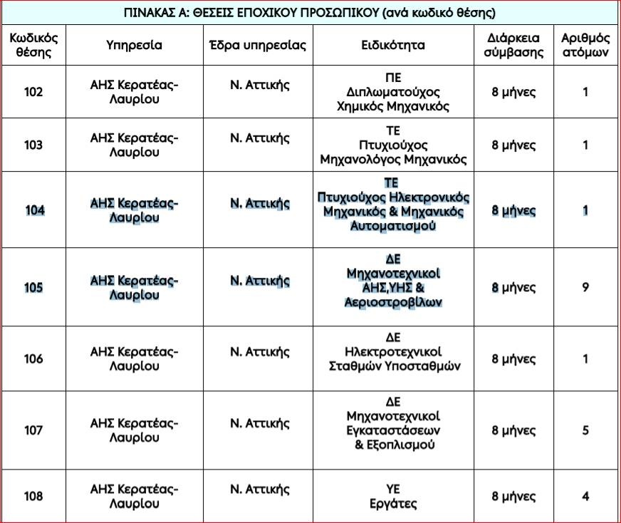 Ο Οργανισμός ανακοινώνει την πρόσληψη, με σύμβαση εργασίας ιδιωτικού δικαίου ορισμένου χρόνου, για την κάλυψη εποχικών ή παροδικών αναγκών του Κλάδου ΑΗΣ Κερατέας-Λαυρίου, που εδρεύει στο Νομό Αττικής.