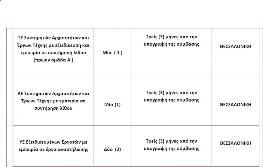Αναλυτικότερα, γνωστοποιείται η πρόσληψη επιστημονικού προσωπικού και λοιπών ειδικοτήτων, με σύμβαση εργασίας ιδιωτικού δικαίου ορισμένου χρόνου για την εκτέλεση αρχαιολογικών εργασιών του υποέργου 1 «Ανάπλαση και Ανάδειξη του αρχαιολογικού χώρου της Αρχαίας Αγοράς της Θεσσαλονίκης» της πράξης «Ανάπλαση και Ανάδειξη του Αρχαιολογικού χώρου της Αρχαίας Αγοράς της Θεσσαλονίκης» για χρονικό διάστημα τριών (3) μηνών από την ημερομηνία υπογραφής της σύμβασης, με δυνατότητα ανανέωσης ή παράτασης της σύμβασης έως την λήξη του υποέργου.