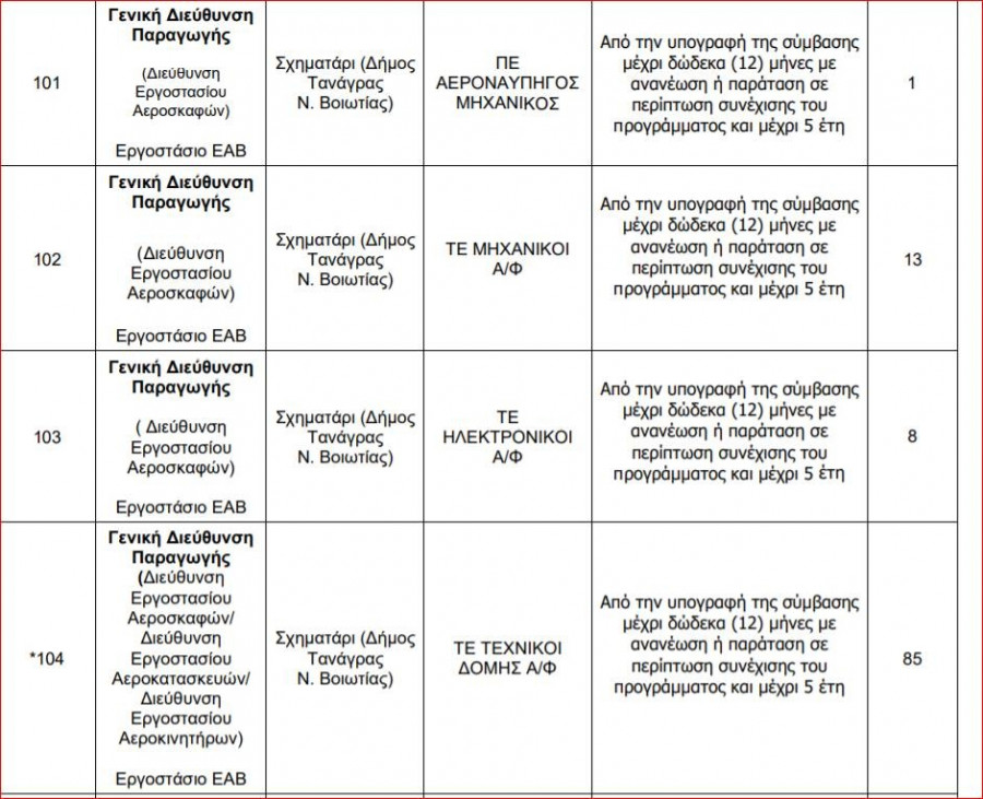 Αναλυτικότερα, η ΕΑΒ ανακοινώνει την πρόσληψη μέσω ΑΣΕΠ, με σύμβαση εργασίας ιδιωτικού δικαίου ορισμένου χρόνου, συνολικά εκατόν έντεκα (111) ατόμων για την υλοποίηση είτε προγραμμάτων συνδεόμενων με ξένους πελάτες είτε της βασικής συμφωνίας με το Ελληνικό Δημόσιο και ειδικότερα για τις λειτουργικές ανάγκες της Γενικής Διεύθυνσης Παραγωγής του Εργοστασίου της ΕΑΒ στην Τανάγρα (Σχηματάρι Βοιωτίας).
