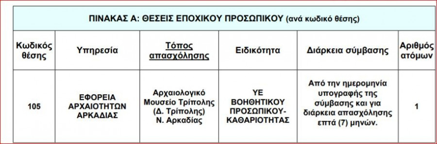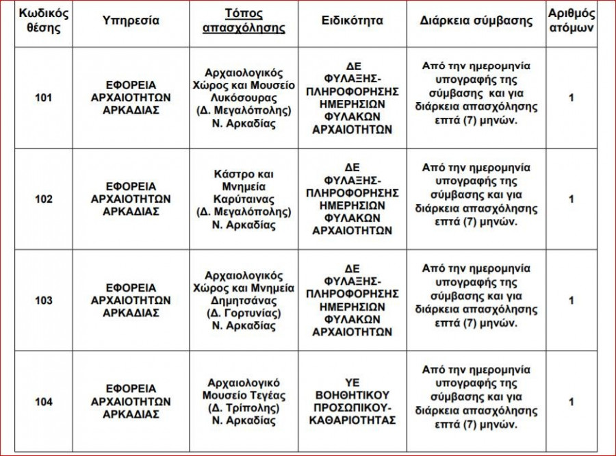 ΑΣΕΠ: Πρόσληψη, με σύμβαση εργασίας ιδιωτικού δικαίου ορισμένου χρόνου, συνολικά πέντε ατόμων για την κάλυψη εποχικών ή παροδικών αναγκών της Εφορείας Αρχαιοτήτων Αρκαδίας, που εδρεύει στην Τρίπολη του Νομού Αρκαδίας